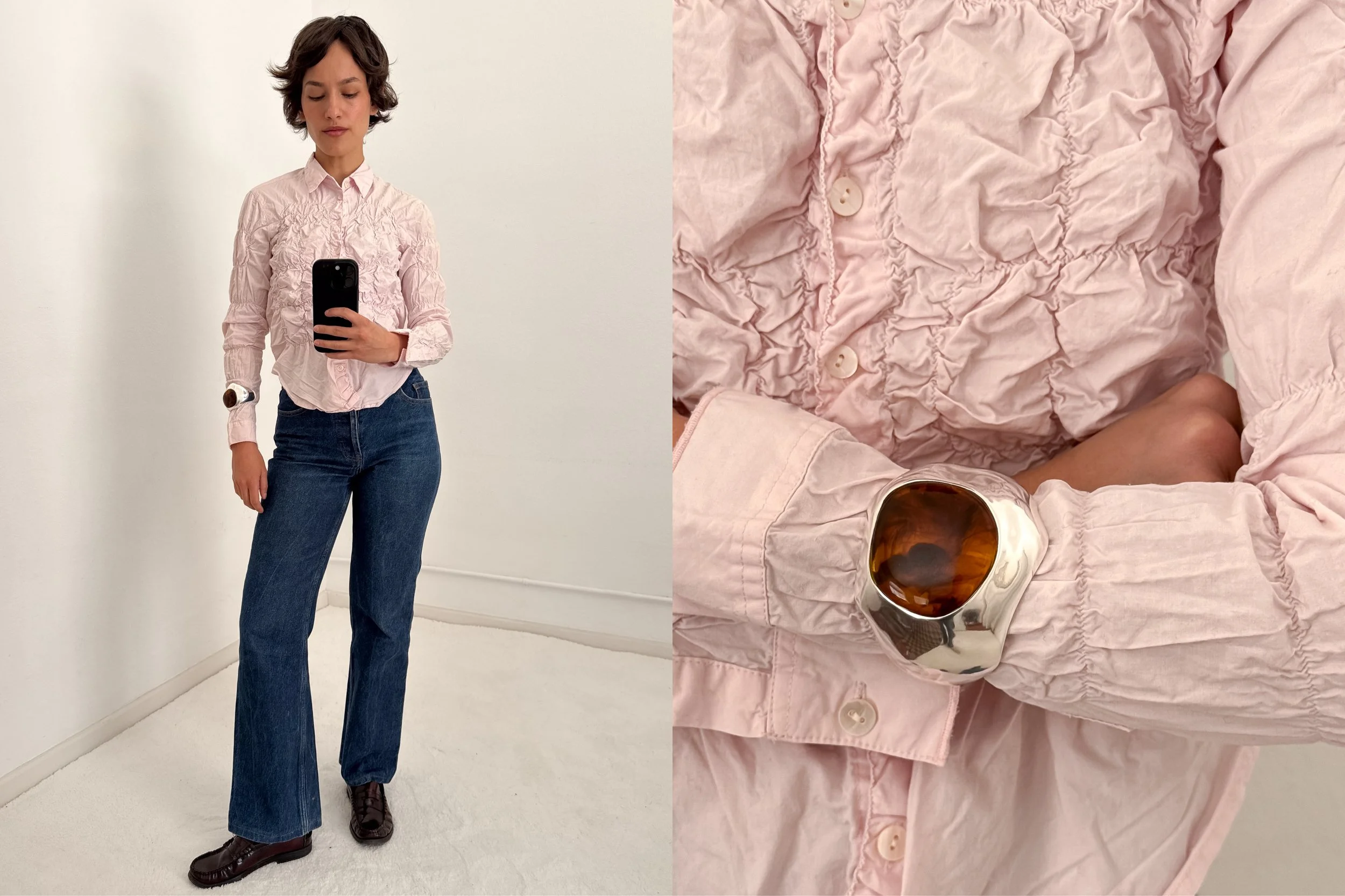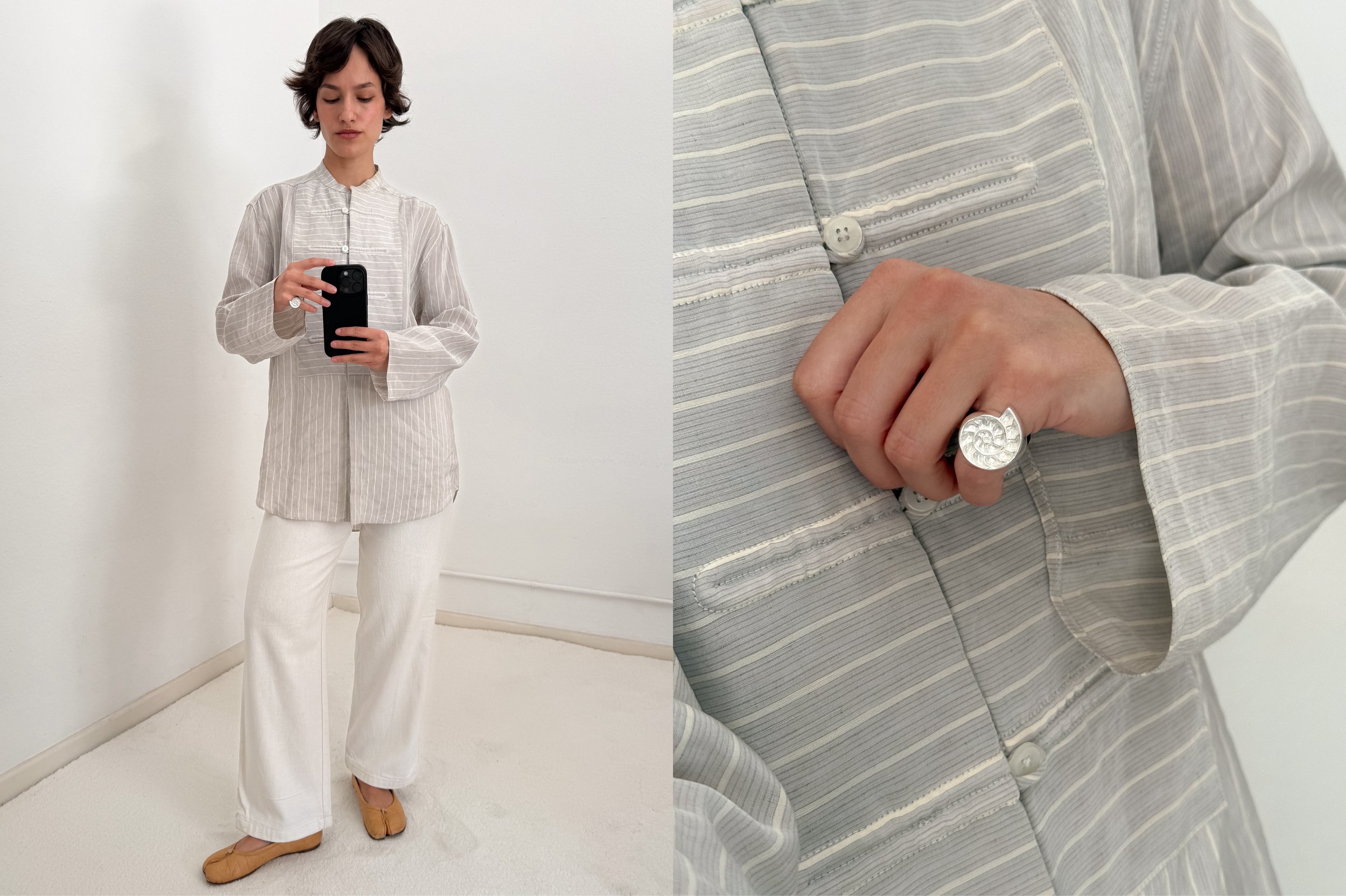 Then there’s the more casual, everyday combination: denim and a textured shirt. This is where I think these pieces work best—when the outfit is almost basic, and the accessory quietly works with the textures of the pieces, making it more interesting.