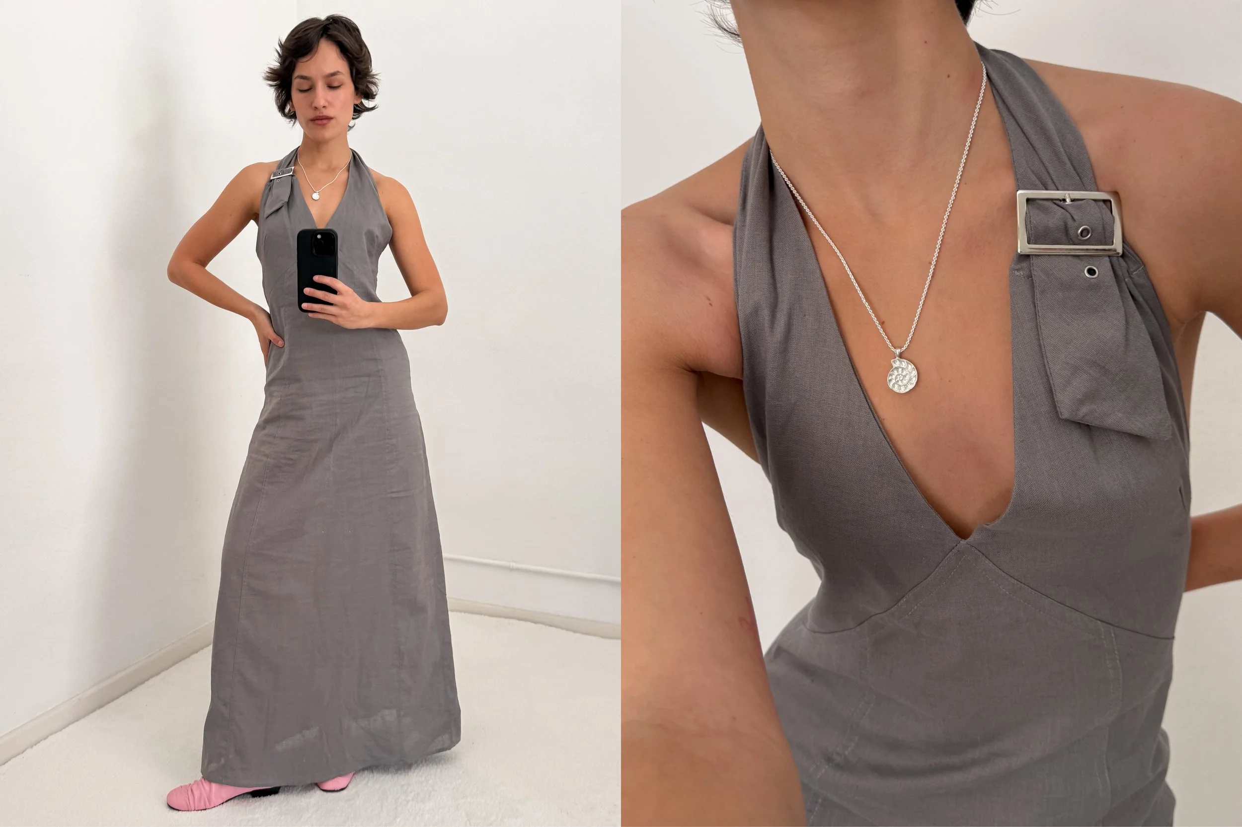 The grey halter dress feels more feminine and fluid, and the jewelry here follows that same energy. Something delicate but with character, adding a subtle shine that moves with the fabric.