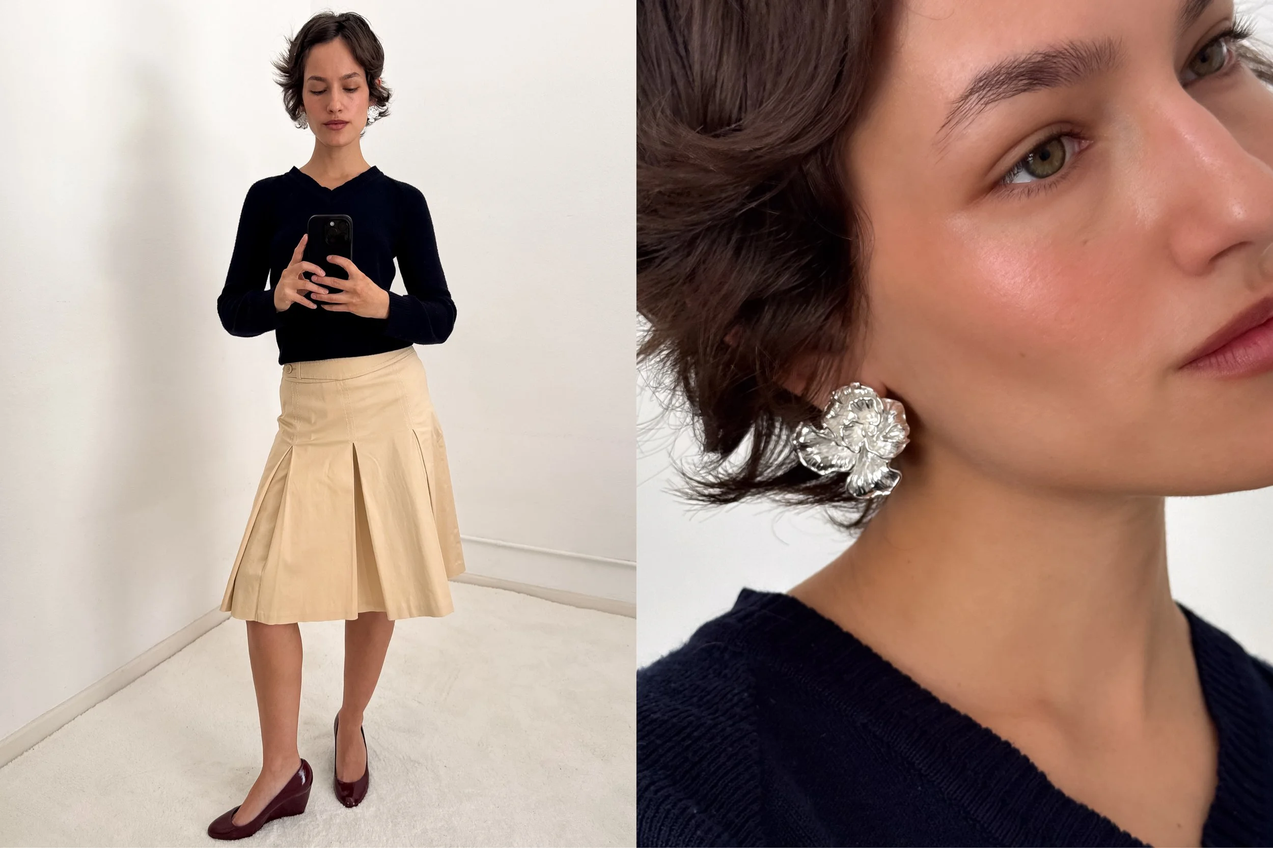 The second look introduces a bit more softness, a navy knit with a beige skirt. Here, the jewelry works differently. Instead of blending in, it becomes the focal point. A statement earring, for example, brings light to the face and elevates the whole look without needing anything else.