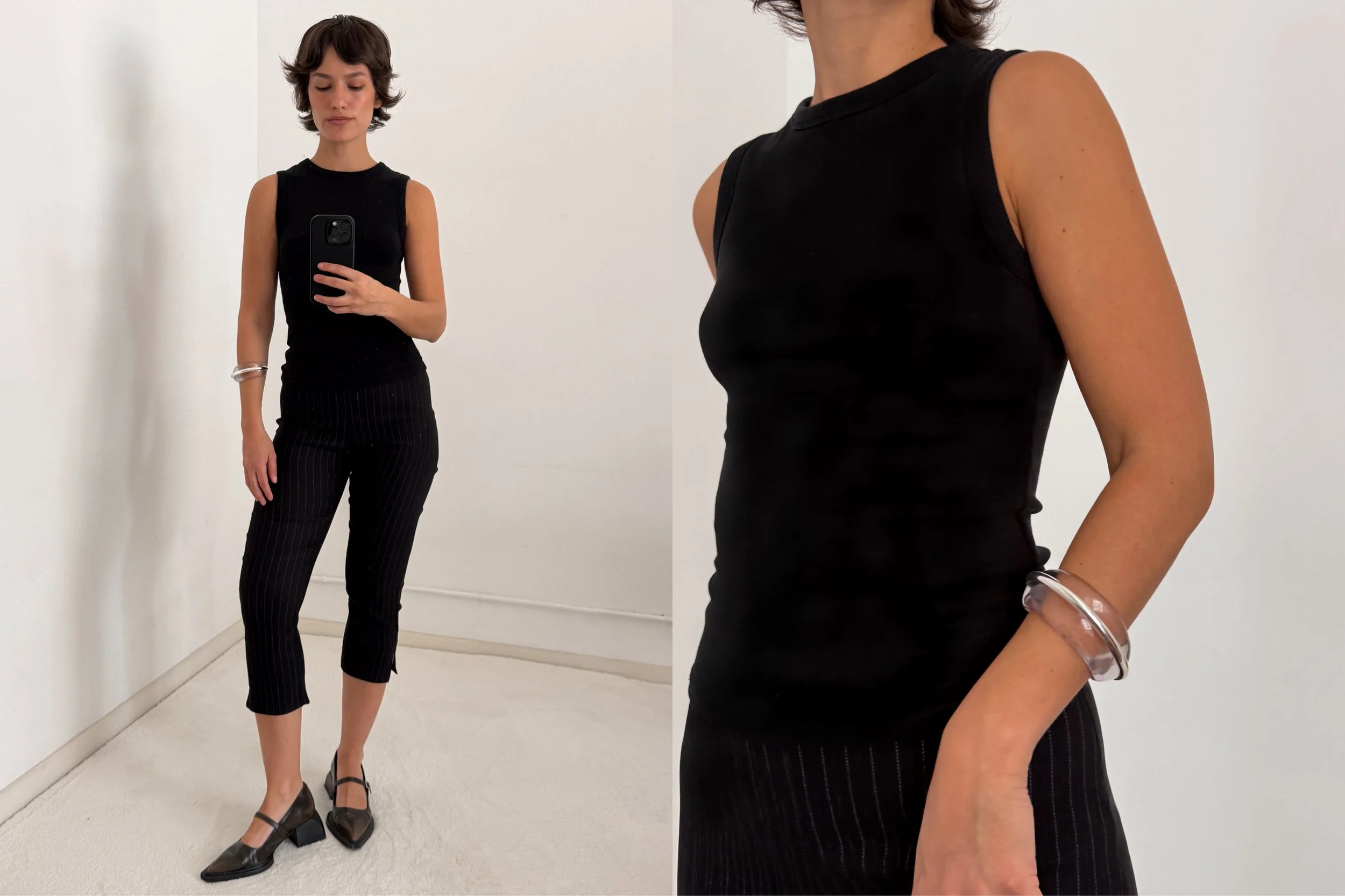The first one is probably the simplest of all: an all-black fitted outfit that feels clean and sharp. On its own, it’s almost too simple, but adding a subtle bangle gives it just enough contrast without breaking the minimal mood. It doesn’t try too hard, it just completes it.